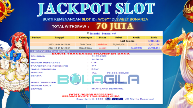 BOLAGILA mengucapkan selamat kepada user id : WO9*** yang telah berhasil mendapatkan jackpot pada permainan SLOT DI SWEET BONANZA. Kemenangan sebesar Rp 70.000.000,-. telah dibayarkan LUNAS oleh pihak bolagila kepada pemilik user id setelah yang bersangkutan mengisi formulir withdraw. Proses pencairan dana berlangsung sangat cepat hanya dalam waktu 6-11 menit sudah berada dalam rekening pemilik user id.