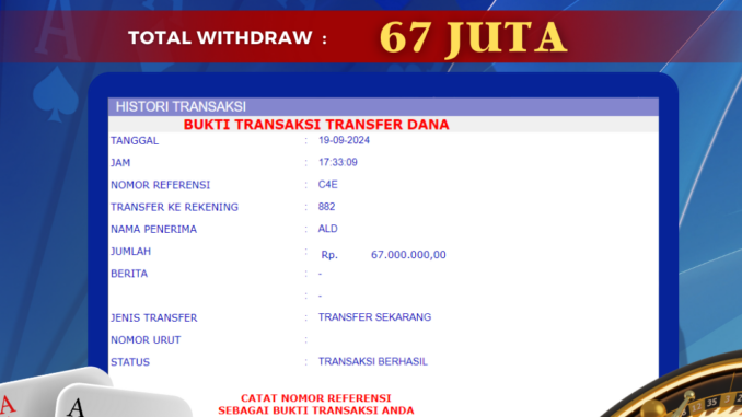 BOLAGILA mengucapkan selamat kepada user id : ALD*** yang telah berhasil mendapatkan jackpot pada permainan LIVE CASINO DI POKER DICE . Kemenangan sebesar Rp 67.000.000,-. telah dibayarkan LUNAS oleh pihak bolagila kepada pemilik user id setelah yang bersangkutan mengisi formulir withdraw. Proses pencairan dana berlangsung sangat cepat hanya dalam waktu 6-11 menit sudah berada dalam rekening pemilik user id.