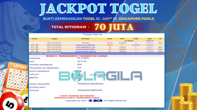 MEMBER BOLAGILA MENERIMA PELUNASAN KEMENANGAN BOLAGILA JACKPOT TOGEL DI SINGAPORE POOLS Rp 70.000.000,- LUNAS