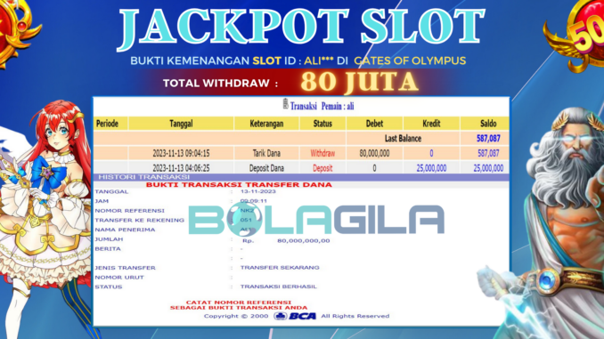 BOLAGILA mengucapkan selamat kepada user id : ALI*** yang telah berhasil mendapatkan jackpot SLOT DI GATE OF OLYMPUS . Kemenangan sebesar Rp 80.000.000,-. telah dibayarkan LUNAS oleh pihak bolagila kepada pemilik user id setelah yang bersangkutan mengisi formulir withdraw. Proses pencairan dana berlangsung sangat cepat hanya dalam waktu 6-11 menit sudah berada dalam rekening pemilik user id.