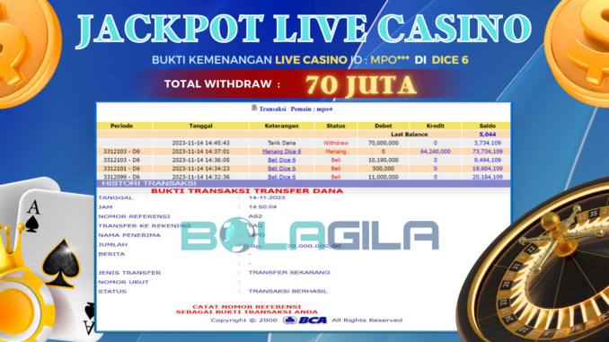 MEMBER BOLAGILA MENERIMA PELUNASAN KEMENANGAN BOLAGILA JACKPOT LIVE CASINO DI DICE 6 Rp 70.000.000,- LUNAS