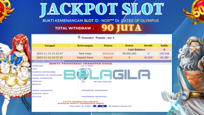 BOLAGILA mengucapkan selamat kepada user id : NOR*** yang telah berhasil mendapatkan jackpot SLOT DI GATES OF OLYMPUS . Kemenangan sebesar Rp 90.000.000,-. telah dibayarkan LUNAS oleh pihak bolagila kepada pemilik user id setelah yang bersangkutan mengisi formulir withdraw. Proses pencairan dana berlangsung sangat cepat hanya dalam waktu 6-11 menit sudah berada dalam rekening pemilik user id.