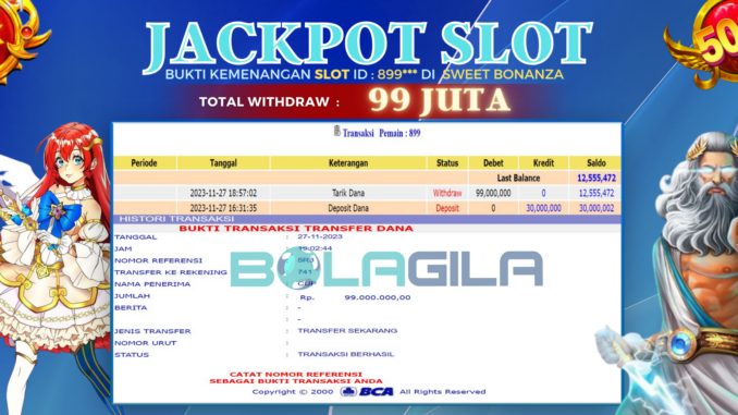 BOLAGILA mengucapkan selamat kepada user id : 899*** yang telah berhasil mendapatkan jackpot SLOT DI SWEET BONANZA. Kemenangan sebesar Rp 99.000.000,-. telah dibayarkan LUNAS oleh pihak bolagila kepada pemilik user id setelah yang bersangkutan mengisi formulir withdraw. Proses pencairan dana berlangsung sangat cepat hanya dalam waktu 6-11 menit sudah berada dalam rekening pemilik user id.