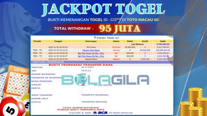 BOLAGILA mengucapkan selamat kepada user id : G13*** yang telah berhasil mendapatkan jackpot TOGEL DI TOTO MACAU 4D. Kemenangan sebesar Rp 95.000.000,-. telah dibayarkan LUNAS oleh pihak bolagila kepada pemilik user id setelah yang bersangkutan mengisi formulir withdraw. Proses pencairan dana berlangsung sangat cepat hanya dalam waktu 6-11 menit sudah berada dalam rekening pemilik user id.