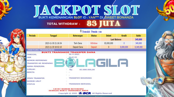 BOLAGILA mengucapkan selamat kepada user id : YAN*** yang telah berhasil mendapatkan jackpot SLOT DI SWEET BONANZA . Kemenangan sebesar Rp 83.000.000,-. telah dibayarkan LUNAS oleh pihak bolagila kepada pemilik user id setelah yang bersangkutan mengisi formulir withdraw. Proses pencairan dana berlangsung sangat cepat hanya dalam waktu 6-11 menit sudah berada dalam rekening pemilik user id.