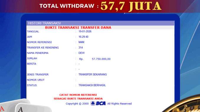 Bukti transfer yang dapat anda lihat adalah bukti SAH / VALID yang langsung di dapatkan melalui bukti transaksi dari Bank yang digunakan untuk pengiriman dana pada rekening pemilik user id. Terima kasih kami sampaikan kepada para pengguna setia BOLAGILA yang telah menggunakan situs kami, sebagai Bandar Terpercaya yang pastinya membayar semua kemenangan member hingga lunas. Apakah BOLAGILA PENIPU ? Reputasi “BOLAGILA TERPERCAYA” sudah sangat melekat.