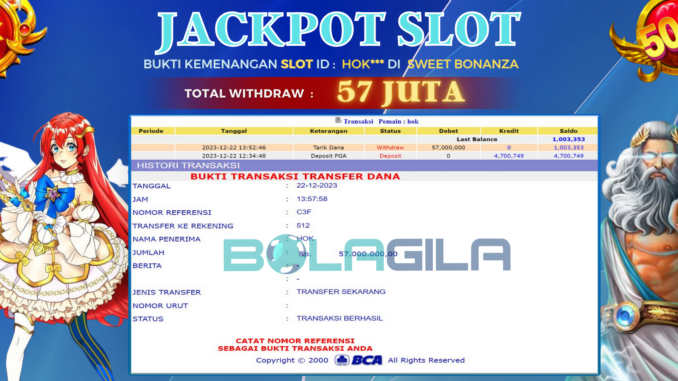 BOLAGILA mengucapkan selamat kepada user id : HOK*** yang telah berhasil mendapatkan jackpot SLOT DI SWEET BONANZA. Kemenangan sebesar Rp 57.000.000,-. telah dibayarkan LUNAS oleh pihak bolagila kepada pemilik user id setelah yang bersangkutan mengisi formulir withdraw. Proses pencairan dana berlangsung sangat cepat hanya dalam waktu 6-11 menit sudah berada dalam rekening pemilik user id.