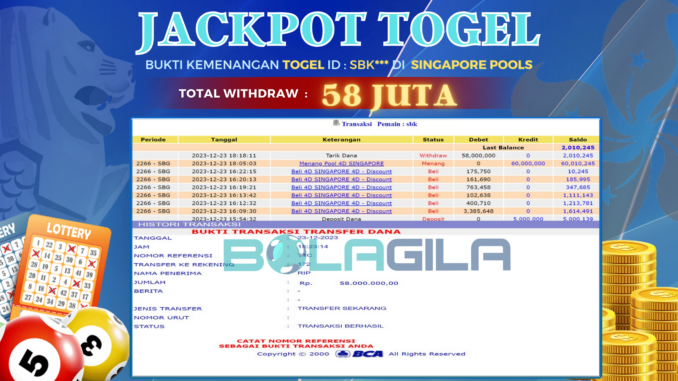 BOLAGILA JACKPOT TOGEL DI SINGAPORE POOLS Rp 58.000.000,- LUNAS