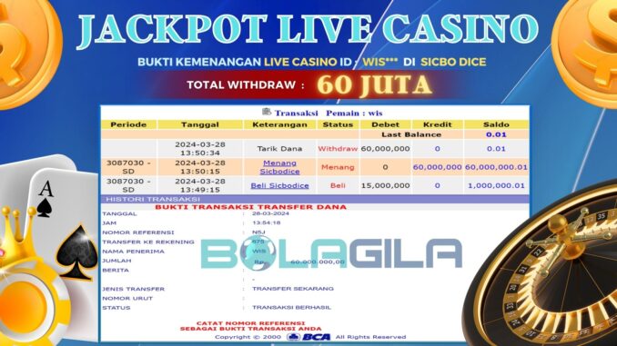 BOLAGILA mengucapkan selamat kepada user id : WIS*** yang telah berhasil mendapatkan jackpot LIVE CASINO DI SICBO DICE. Kemenangan sebesar Rp 60.000.000,-. telah dibayarkan LUNAS oleh pihak bolagila kepada pemilik user id setelah yang bersangkutan mengisi formulir withdraw. Proses pencairan dana berlangsung sangat cepat hanya dalam waktu 6-11 menit Sudah berada dalam rekening pemilik user id.
