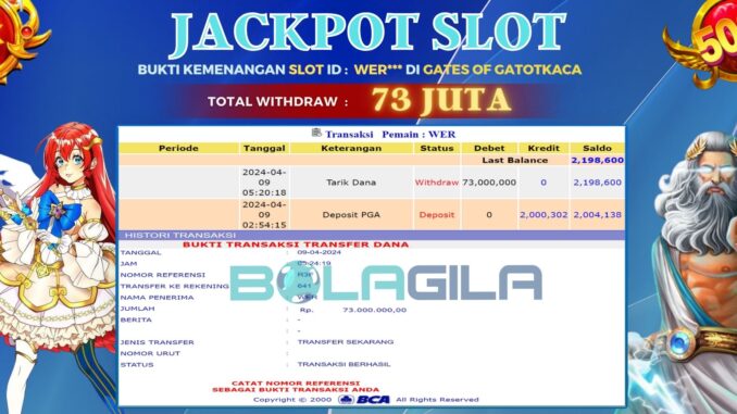 BOLAGILA mengucapkan selamat kepada user id : WER*** yang telah berhasil mendapatkan jackpot SLOT DI GATES OF GATOTKACA. Kemenangan sebesar Rp 73.000.000,-. telah dibayarkan LUNAS oleh pihak bolagila kepada pemilik user id setelah yang bersangkutan mengisi formulir withdraw. Proses pencairan dana berlangsung sangat cepat hanya dalam waktu 6-11 menit Sudah berada dalam rekening pemilik user id.