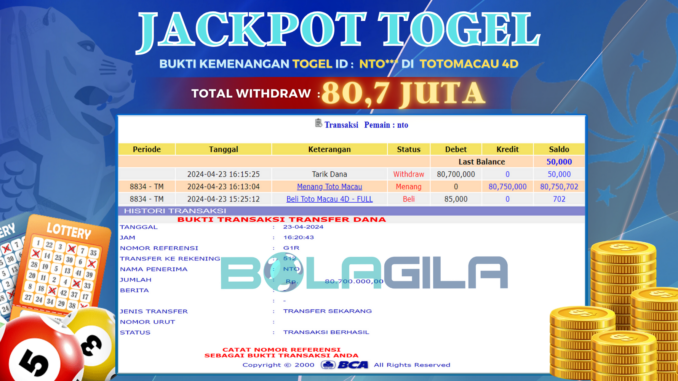 BOLAGILA JACKPOT TOGEL DI TOTO MACAU 4D Rp 80.700.000,- LUNAS