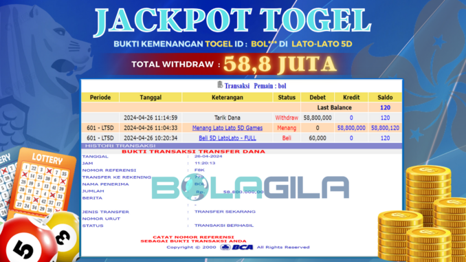 MEMBER BOLAGILA MENERIMA PELUNASAN KEMENANGAN JACKPOT TOGEL DI LATO LATO 5D Rp 58.800.000,- LUNAS