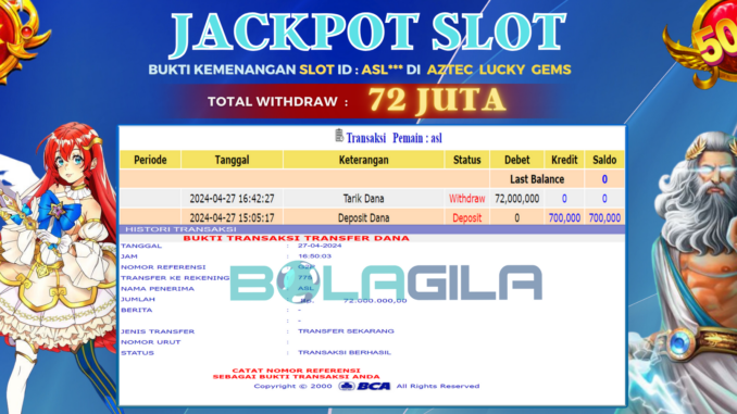 BOLAGILA mengucapkan selamat kepada user id : ASL*** yang telah berhasil mendapatkan jackpot SLOT DI AZTEC LUCKY GEMS. Kemenangan sebesar Rp 72.000.000,-. telah dibayarkan LUNAS oleh pihak bolagila kepada pemilik user id setelah yang bersangkutan mengisi formulir withdraw. Proses pencairan dana berlangsung sangat cepat hanya dalam waktu 6-11 menit Sudah berada dalam rekening pemilik user id.