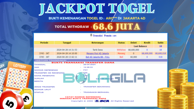 BOLAGILA JACKPOT TOGEL DI JAKARTA 4D Rp 68.600.000,- LUNAS