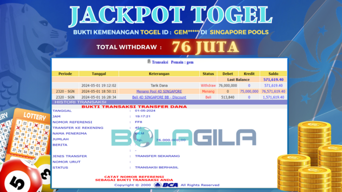 BOLAGILA mengucapkan selamat kepada user id : GEM*** yang telah berhasil mendapatkan jackpot TOGEL di SINGAPORE POOLS. Kemenangan sebesar Rp 76.000.000,-. telah dibayarkan LUNAS oleh pihak bolagila kepada pemilik user id setelah yang bersangkutan mengisi formulir withdraw. Proses pencairan dana berlangsung sangat cepat hanya dalam waktu 6-11 menit Sudah berada dalam rekening pemilik user id.