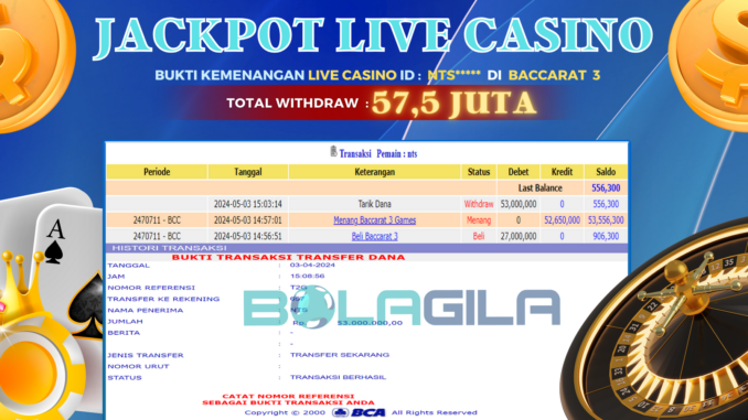 BOLAGILA JACKPOT LIVE CASINO DI BACCARAT 3 Rp 57.500.000,- LUNAS