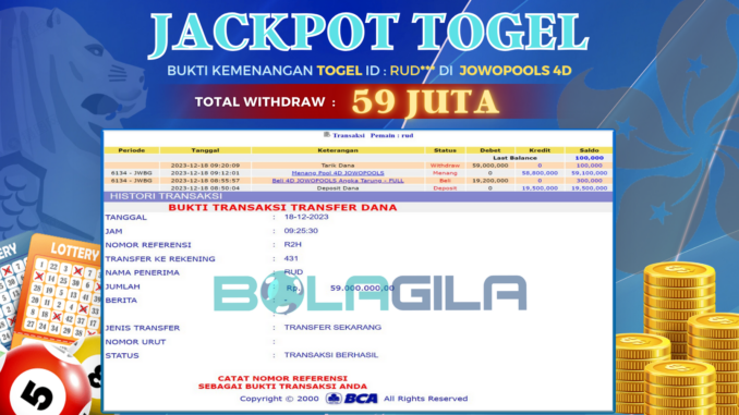 BOLAGILA JACKPOT TOGEL DI JOWOPOOLS 4D Rp 59.000.000,- LUNAS