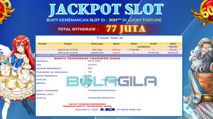 MEMBER BOLAGILA MENERIMA PELUNASAN KEMENANGAN BOLAGILA JACKPOT SLOT DI LUCKY FORTUNE Rp 77.000.000,- LUNAS