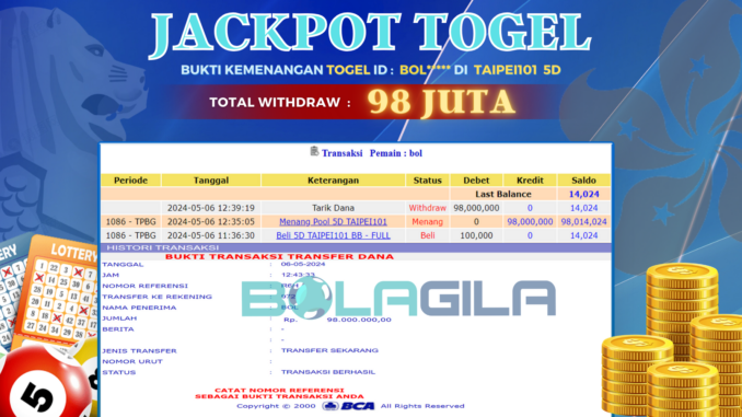 BOLAGILA mengucapkan selamat kepada user id : BOL*** yang telah berhasil mendapatkan jackpot TOGEL DI TAIPEI101 5D. Kemenangan sebesar Rp 98.00.000,-. telah dibayarkan LUNAS oleh pihak bolagila kepada pemilik user id setelah yang bersangkutan mengisi formulir withdraw. Proses pencairan dana berlangsung sangat cepat hanya dalam waktu 6-11 menit Sudah berada dalam rekening pemilik user id.