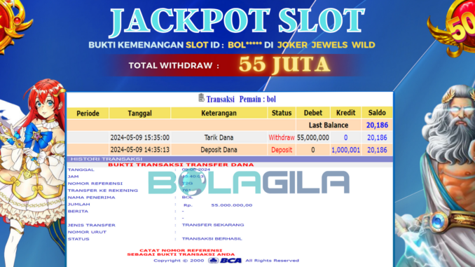 MEMBER BOLAGILA MENERIMA PELUNASAN KEMENANGAN JACKPOT SLOT DI JOKER JEWELS WILD Rp 55.000.000,- LUNAS