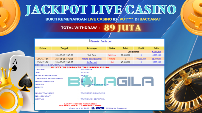 BOLAGILA JACKPOT LIVE CASINO DI BACCARAT Rp 89.000.000,- LUNAS