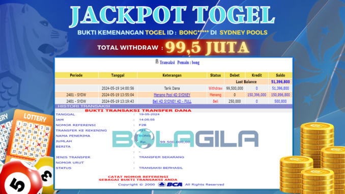 BOLAGILA JACKPOT TOGEL DI SYDNEY POOLS Rp 99.500.000,- LUNAS