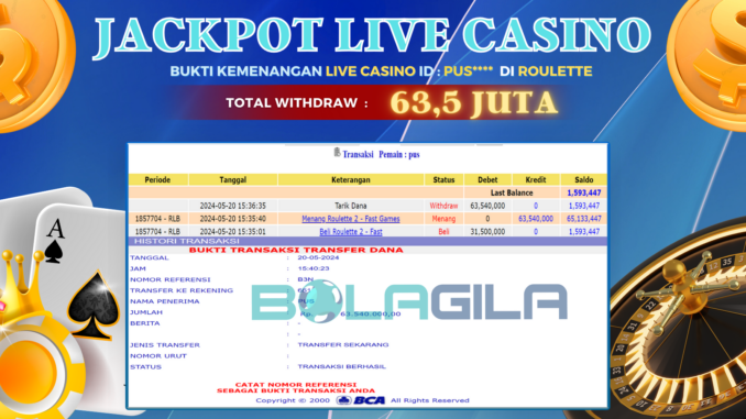 BOLAGILA JACKPOT LIVE CASINO DI ROULETTE Rp 63.500.000,- LUNAS