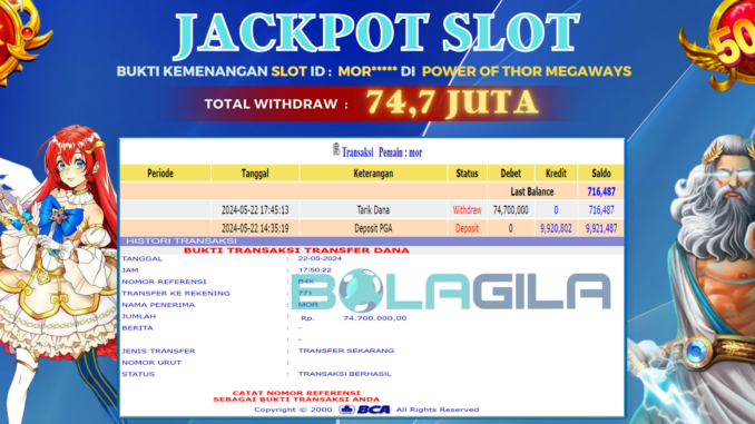 MEMBER BOLAGILA MENERIMA PELUNASAN KEMENANGAN JACKPOT SLOT DI POWER OF THOR MEGAWAYS Rp 74.700.000,- LUNAS