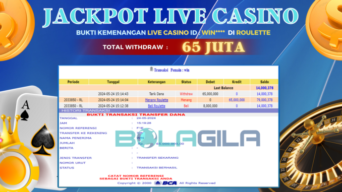 BOLAGILA JACKPOT LIVE CASINO DI ROULETTE Rp 65.000.000,- LUNAS