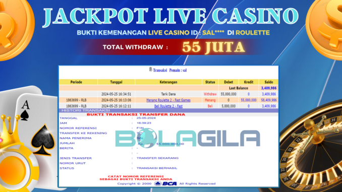 BOLAGILA JACKPOT LIVE CASINO DI ROULETTE Rp 55.000.000,- LUNAS