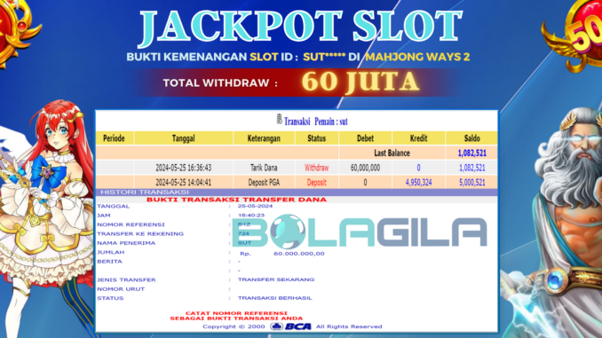 BOLAGILA mengucapkan selamat kepada user id : SUT*** yang telah berhasil mendapatkan jackpot SLOT DI MAHJONG WAYS II. Kemenangan sebesar Rp 60.000.000,-. telah dibayarkan LUNAS oleh pihak bolagila kepada pemilik user id setelah yang bersangkutan mengisi formulir withdraw. Proses pencairan dana berlangsung sangat cepat hanya dalam waktu 6-11 menit Sudah berada dalam rekening pemilik user id.