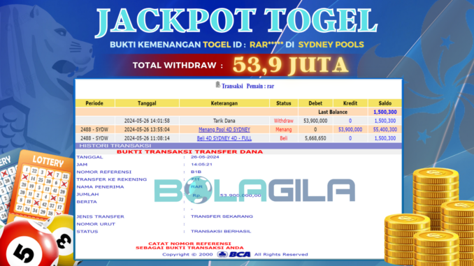 BOLAGILA JACKPOT TOGEL DI SYDNEY POOLS Rp 53.900.000,- LUNAS