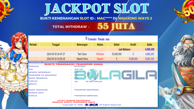 BOLAGILA mengucapkan selamat kepada user id : MAC*** yang telah berhasil mendapatkan jackpot SLOT DI MAHJONG WAYS 2. Kemenangan sebesar Rp 55.000.000,-. telah dibayarkan LUNAS oleh pihak bolagila kepada pemilik user id setelah yang bersangkutan mengisi formulir withdraw. Proses pencairan dana berlangsung sangat cepat hanya dalam waktu 6-11 menit Sudah berada dalam rekening pemilik user id.