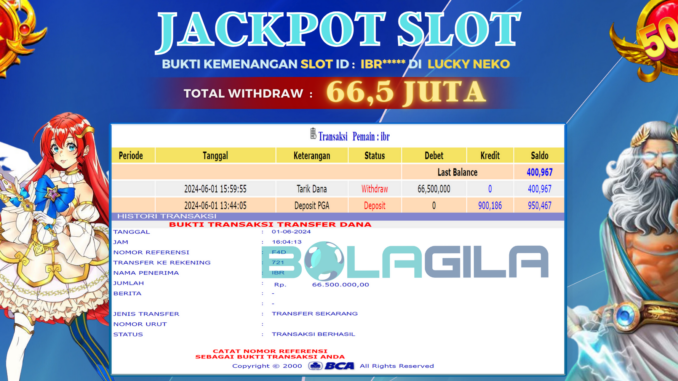 BOLAGILA mengucapkan selamat kepada user id : IBR*** yang telah berhasil mendapatkan jackpot SLOT DI LUCKY NEKO. Kemenangan sebesar Rp 66.500.000,-. telah dibayarkan LUNAS oleh pihak bolagila kepada pemilik user id setelah yang bersangkutan mengisi formulir withdraw. Proses pencairan dana berlangsung sangat cepat hanya dalam waktu 6-11 menit Sudah berada dalam rekening pemilik user id.