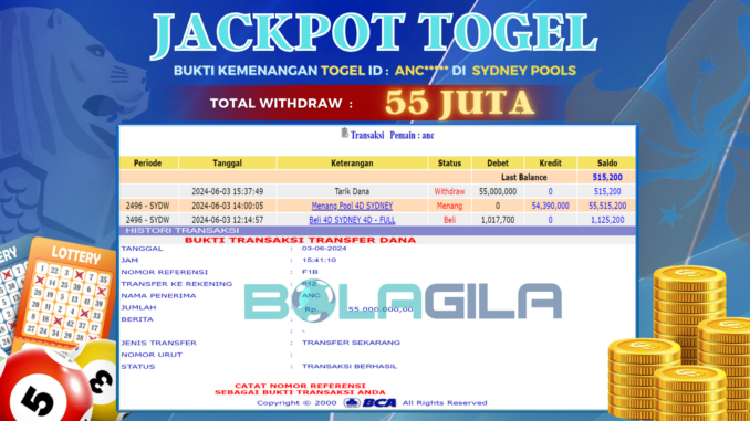 MEMBER BOLAGILA MENERIMA PELUNASAN KEMENANGAN JACKPOT TOGEL DI SYDNEY POOLS Rp 55.000.000,- LUNAS