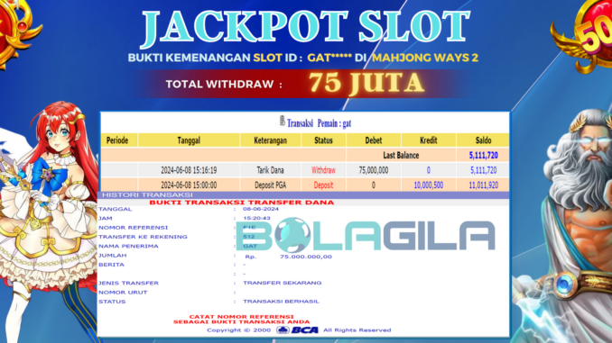 BOLAGILA mengucapkan selamat kepada user id: GAT*** yang telah berhasil mendapatkan jackpot SLOT DI MAHJONG WAYS 2 . Kemenangan sebesar Rp 75.000.000,-. telah dibayarkan LUNAS oleh pihak bolagila kepada pemilik user id setelah yang bersangkutan mengisi formulir withdraw. Proses pencairan dana berlangsung sangat cepat hanya dalam waktu 6-11 menit Sudah berada dalam rekening pemilik user id.