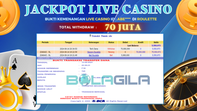 BOLAGILA mengucapkan selamat kepada user id: ABE*** yang telah berhasil mendapatkan jackpot LIVE CASINO DI ROULETTE . Kemenangan sebesar Rp 70.000.000,-. telah dibayarkan LUNAS oleh pihak bolagila kepada pemilik user id setelah yang bersangkutan mengisi formulir withdraw. Proses pencairan dana berlangsung sangat cepat hanya dalam waktu 6-11 menit Sudah berada dalam rekening pemilik user id.