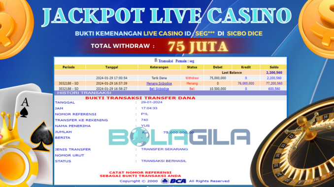 BOLAGILA mengucapkan selamat kepada user id : SEG*** yang telah berhasil mendapatkan jackpot LIVE CASINO di SICBO DICE. Kemenangan sebesar Rp 75.000.000,-. telah dibayarkan LUNAS oleh pihak bolagila kepada pemilik user id setelah yang bersangkutan mengisi formulir withdraw. Proses pencairan dana berlangsung sangat cepat hanya dalam waktu 6-11 menit sudah berada dalam rekening pemilik user id.
