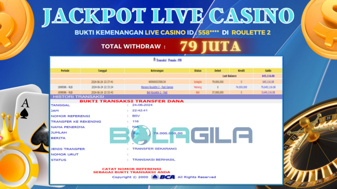 BOLAGILA mengucapkan selamat kepada user id : 558*** yang telah berhasil mendapatkan jackpot LIVE CASINO di ROULETTE 2. Kemenangan sebesar Rp 79.000.000,-. telah dibayarkan LUNAS oleh pihak bolagila kepada pemilik user id setelah yang bersangkutan mengisi formulir withdraw. Proses pencairan dana berlangsung sangat cepat hanya dalam waktu 6-11 menit Sudah berada dalam rekening pemilik user id.