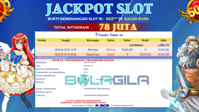 BOLAGILA mengucapkan selamat kepada user id : RZZ*** yang telah berhasil mendapatkan jackpot SLOT di SUGAR RUSH. Kemenangan sebesar Rp 78.000.000,-. telah dibayarkan LUNAS oleh pihak bolagila kepada pemilik user id setelah yang bersangkutan mengisi formulir withdraw. Proses pencairan dana berlangsung sangat cepat hanya dalam waktu 6-11 menit Sudah berada dalam rekening pemilik user id.