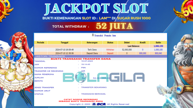 MEMBER BOLAGILA MENERIMA PELUNASAN JACKPOT SLOT DI SUGAR RUSH 1000 Rp 52.000.000,- LUNAS