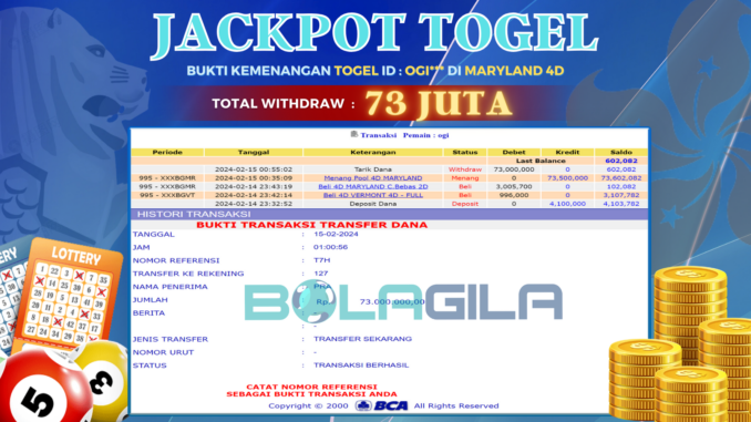 BOLAGILA mengucapkan selamat kepada user id : OGI*** yang telah berhasil mendapatkan jackpot TOGEL DI MARYLAND 4D. Kemenangan sebesar Rp 73.000.000,-. telah dibayarkan LUNAS oleh pihak bolagila kepada pemilik user id setelah yang bersangkutan mengisi formulir withdraw. Proses pencairan dana berlangsung sangat cepat hanya dalam waktu 6-11 menit sudah berada dalam rekening pemilik user id.