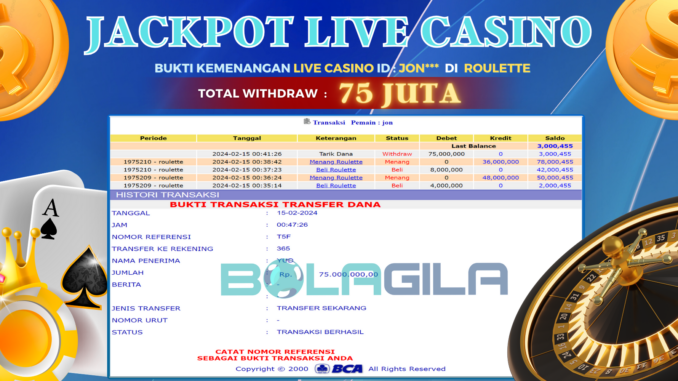 BOLAGILA JACKPOT LIVE CASINO DI ROULETTE Rp 75.000.000,- LUNAS