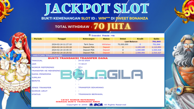 BOLAGILA mengucapkan selamat kepada user id : WIN*** yang telah berhasil mendapatkan jackpot SLOT DI SWEET BONANZA. Kemenangan sebesar Rp 70.000.000,-. telah dibayarkan LUNAS oleh pihak bolagila kepada pemilik user id setelah yang bersangkutan mengisi formulir withdraw. Proses pencairan dana berlangsung sangat cepat hanya dalam waktu 6-11 menit sudah berada dalam rekening pemilik user id.