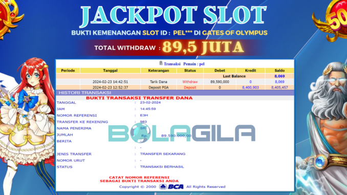BOLAGILA mengucapkan selamat kepada user id : PEL*** yang telah berhasil mendapatkan jackpot SLOT DI GATES OF OLYMPUS. Kemenangan sebesar Rp 89.500.000,-. telah dibayarkan LUNAS oleh pihak bolagila kepada pemilik user id setelah yang bersangkutan mengisi formulir withdraw. Proses pencairan dana berlangsung sangat cepat hanya dalam waktu 6-11 menit sudah berada dalam rekening pemilik user id.
