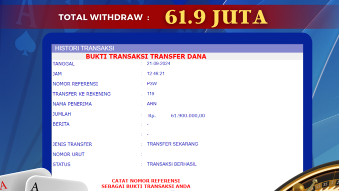 Bukti transfer yang dapat anda lihat adalah bukti SAH / VALID yang langsung di dapatkan melalui bukti transaksi dari Bank yang digunakan untuk pengiriman dana pada rekening pemilik user id. Terima kasih kami sampaikan kepada para pengguna setia BOLAGILA yang telah menggunakan situs kami, sebagai Bandar Terpercaya yang pastinya membayar semua kemenangan member hingga lunas. Apakah BOLAGILA PENIPU ? Reputasi “BOLAGILA TERPERCAYA” sudah sangat melekat.