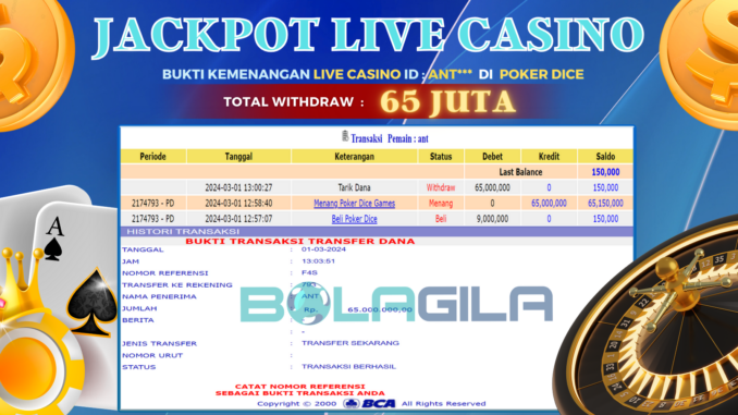 BOLAGILA mengucapkan selamat kepada user id : ANT*** yang telah berhasil mendapatkan jackpot LIVE CASINO DI POKER DICE. Kemenangan sebesar Rp 65.000.000,-. telah dibayarkan LUNAS oleh pihak bolagila kepada pemilik user id setelah yang bersangkutan mengisi formulir withdraw. Proses pencairan dana berlangsung sangat cepat hanya dalam waktu 6-11 menit sudah berada dalam rekening pemilik user id.