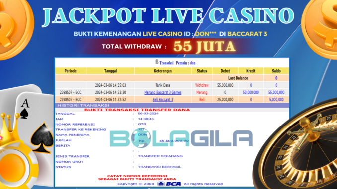 BOLAGILA JACKPOT LIVE CASINO DI BACCARAT 3 Rp 55.000.000,- LUNAS