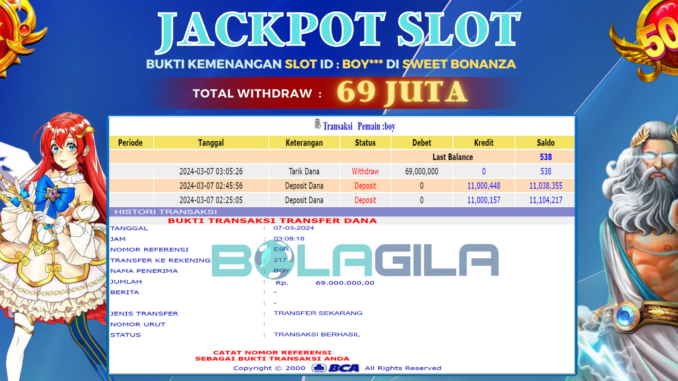 BOLAGILA mengucapkan selamat kepada user id : BOY*** yang telah berhasil mendapatkan jackpot SLOT DI SWEET BONANZA. Kemenangan sebesar Rp 50.000.000,-. telah dibayarkan LUNAS oleh pihak bolagila kepada pemilik user id setelah yang bersangkutan mengisi formulir withdraw. Proses pencairan dana berlangsung sangat cepat hanya dalam waktu 6-11 menit sudah berada dalam rekening pemilik user id.