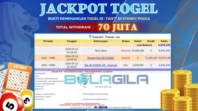 BOLAGILA JACKPOT TOGEL DI SYDNEY POOLS Rp 70.000.000,- LUNAS
